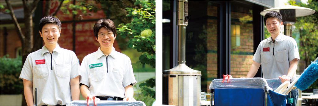時代にあわせて進化し続けるスカイビルをイメージしたファッシ ョナブルなデザインで、多くのお客様から好評を頂いております。作業道具を入れるのに便利な前掛けや吸汗速乾に優れたシャツなど、使い手を考えた機能でスタッフたちのモチベーションも自然とアップしています。