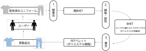 衣料品に含まれるポリエステル繊維を溶かし出し、精製して、もう一度ポリエステル繊維の原料であるポリエステル(PET)樹脂を製造するケミカルリサイクルの技術開発に成功しました。この技術で、衣料品に使われる石油資源の使用量を減らしていくことを目指します。